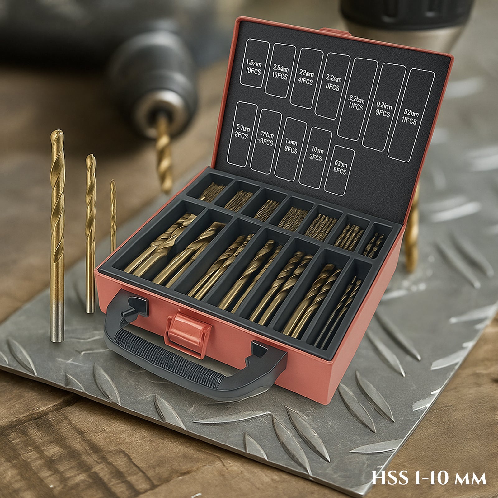 Set vrhunskih kobaltnih svrdla HSS 🛠️ za bušenje tvrdog metala i nehrđajućeg čelika, u skladu s DIN 338 (metrički standard), dolazi u praktičnom i izdržljivom koferu 🎒.